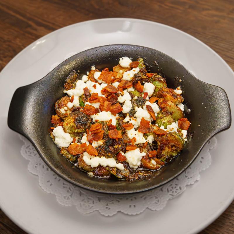 charred in bacon fat with shallots, bacon, apple butter, and goat cheese.
