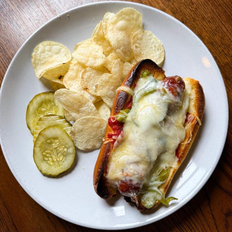 Smoked Sausage, sautéed onion & green peppers. Baked on a ciabatta steak roll with Parmesan cheese, provolone cheese & smoked marinara sauce.