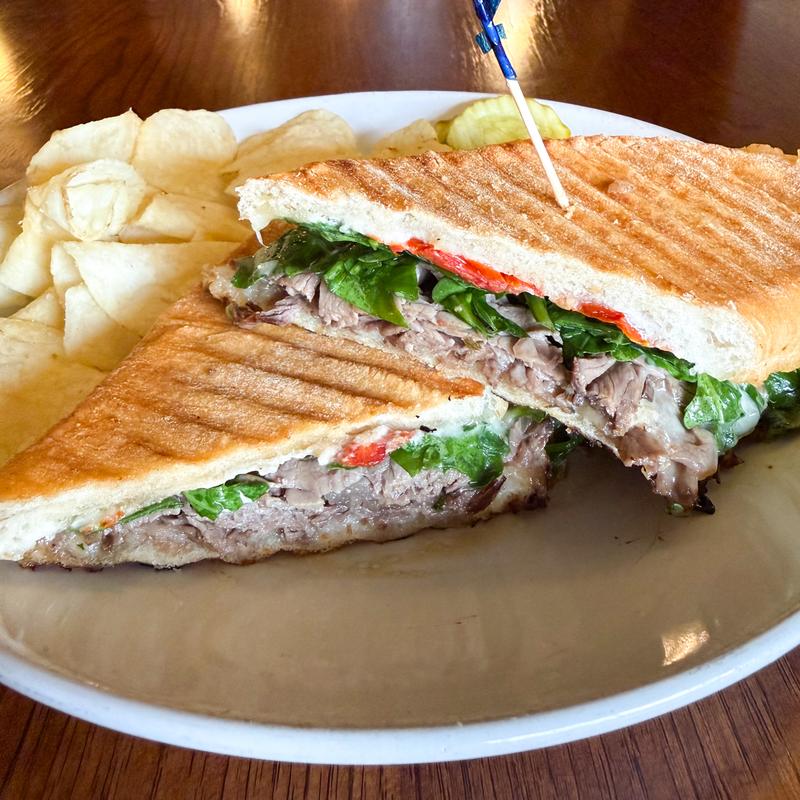 Sliced prime rib, monterey jack cheese, horseradish sauce, roasted tomatoes, & arugula pressed on a ciabatta bread.