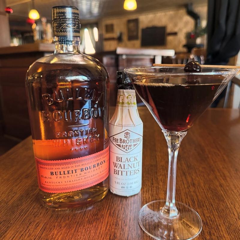 Served Up with Bulleit Bourbon, Sweet Vermouth, black walnut bitters, vanilla simple syrup and a bourbon cherry.