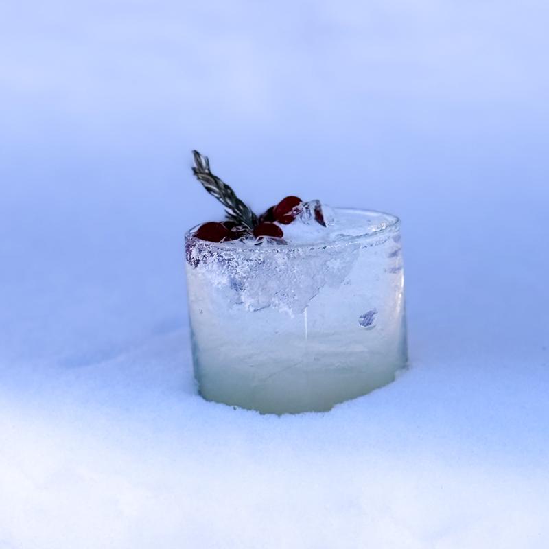 Jose Silver tequila, fresh lime juice, rosemary simple syrup, and white cranberry juice. Garnished with a sugar rim, cranberries, and a sprig of rosemary.