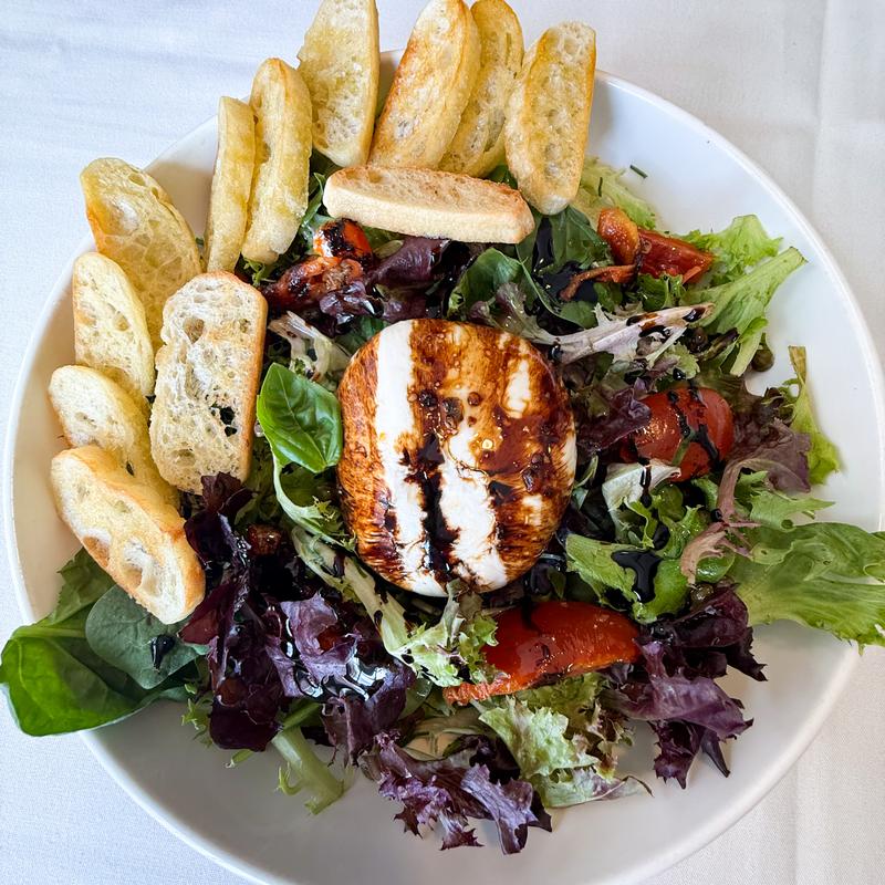 A bed of spring mix with roasted tomatoes, capers & basil. Served with a balsamic reduction drizzle and crostini’s.