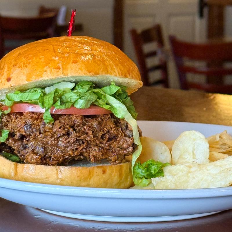 A fried chicken thigh, drizzled in hot honey, shredded lettuce, and sliced tomato. Served on a brioche bun.